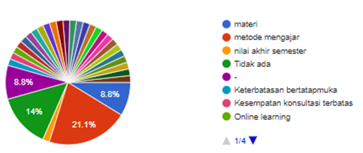 Dalam keadaan pandemi covid 19, proses perkuliahan diharapkan untuk dilakukan secara daring melalui sosial media, maupun platform perkuliahan daring Undip (Kulon, MSTEAMS, CISCOWEBEX). Dari survei yang sama didapatkan tingkat kepuasan terhadap pelaksanaan kuliah daring dengan hasil 42% puas dan 16% sangat puas seperti yang terlihat pada diagram 3. Selama perkuliahan dalam jaringan tersebut ditemukan beberapa masalah berupa : 1. metode mengajar yang belum sesuai keinginan mahasiswa, 2. materi yang kurang jelas menurut mahasiswa, 3. keterbatasan tatap muka yang dirasa masih diperlukan oleh mahasiswa dan 14% menyatakan tidak ada permasalahan dalam perkuliahan daring (diagram 3)