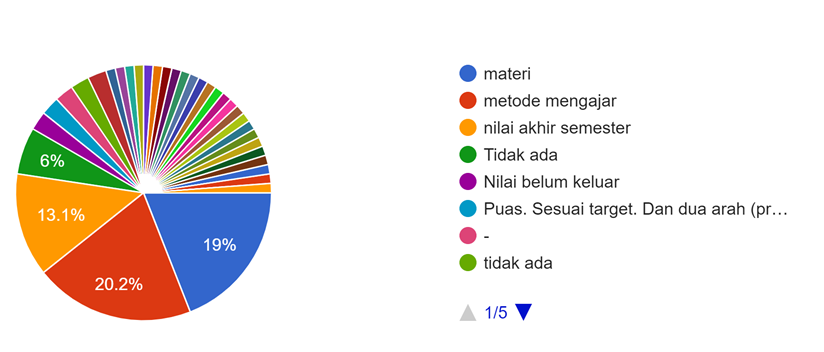 Hal yang membuat warga DAFT tidak puas adalah metode mengajar (20.2%), Materi PBM (19%), dan nilai akhir semester (13.1%). Akibat pandemi, maka metode mengajar secara darin/online diberlakukan. Tetapi menurut mahasiwa terdapat 2.4% yang belum memberlakukan secara daring sesuai harapan dan edaran Universitas (diagram 4).